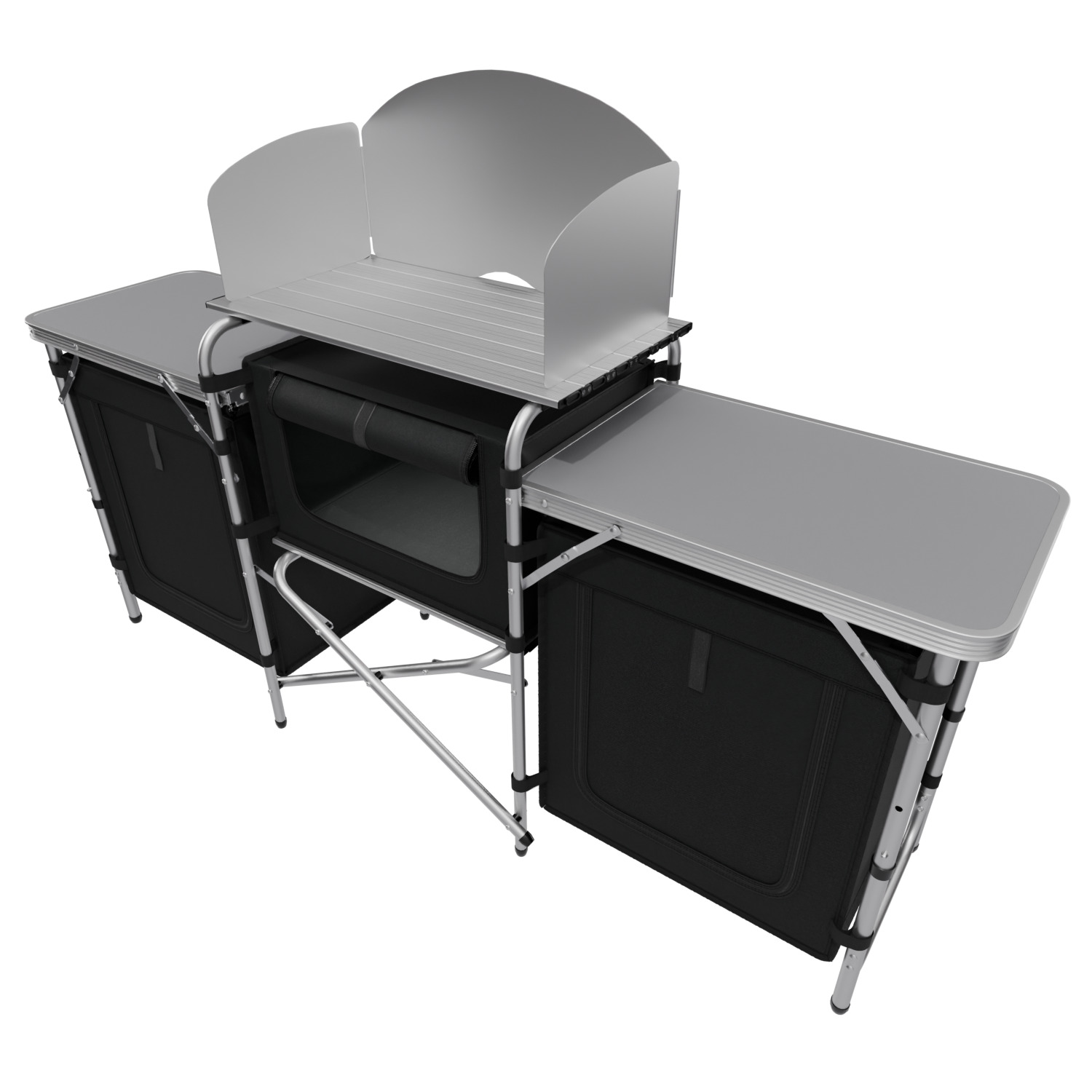 24MOVE® Campingküche CAMPO – die mobile Kochstation mit Windschutz und Stauraum Die Campingküche CAMPO von 24MOVE® bietet durchdachten Komfort für alle, die unterwegs nicht auf funktionales Kochen verzichten möchten. Sie ist faltbar, schnell aufgebaut und perfekt für den Einsatz beim Camping, auf dem Festival oder im Garten geeignet. Das stabile Aluminiumgestell mit verstellbarer Höhe (70, 80 oder 110 cm) sorgt für sicheres Arbeiten – auch auf unebenem Gelände. Die große Arbeitsplatte ist hitzebeständig und pflegeleicht. Zwei seitliche Ablagen erweitern die Nutzfläche und bieten zusätzlichen Platz für Töpfe, Zutaten oder Kochgeschirr. Ein geräumiges Staufach mit verschließbarer Front und mehreren Regalböden bietet geschützten Platz für Vorräte und Utensilien. Die robuste Stoffbespannung mit Mesh-Einsätzen sorgt für gute Belüftung. Ein zusätzlicher Windschutz verbessert die Nutzbarkeit bei windigem Wetter. Nach dem Einsatz lässt sich die komplette Küche kompakt zusammenklappen und in der mitgelieferten Tragetasche verstauen. Leicht zu transportieren und flexibel einsetzbar – die CAMPO ist ein praktischer Begleiter für jedes Outdoor-Abenteuer.