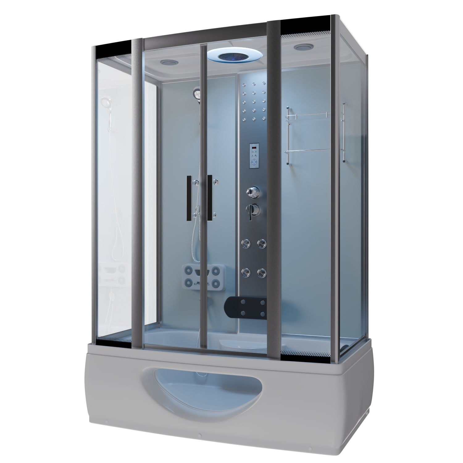 TroniTechnik® Duschtempel Dusche IKARIA 135×80 cm mit Farblicht und Komfortsitz Komfortable Komplettdusche mit intelligenter Raumaufteilung Verlagerter Sitz schafft mehr Bewegungsfreiheit und erhöht den Liegekomfort im Vergleich zu mittig verbauten Modellen. Rundumverglasung aus Sicherheitsglas, verstärkter Acrylboden mit Anti-Rutsch-Struktur und höhenverstellbare Füße für sicheren Stand. Ausstattung für ein modernes Duscherlebnis Duschhimmel mit tropischem Regeneffekt, integrierter Abluftfunktion und optionalem Ozongenerator (nur bei Dampfdusche). Benutzerfreundliches Touch-Bedienelement mit Radio (FM), Licht- und Ventilatorsteuerung sowie Farblichttherapie. Robuste Verarbeitung und hochwertige Materialien Rahmen aus pulverbeschichtetem Aluminium – rostfrei und langlebig, Türen mit Magnetschienen und Leichtlauf-Rollensystem. Glasfaserverstärkter Sanitär-Acrylboden mit Stahlunterbau – belastbar und rutschhemmend durch wellige Struktur. Einfache Installation & durchdachte Technik Anschluss über Standard-Schuko-Stecker (220–230 V), Wasserzuläufe über 1/2″-Flexschläuche, 40 mm Abwasseranschluss. Für den Betrieb mit einem Durchlauferhitzer geeignet – keine zusätzlichen Geräte erforderlich. Zusätzliche Ausstattung für mehr Komfort Integrierter Sitz, Glasregal für Pflegeprodukte, Fußreflexzonen-Massage und einstellbare Beleuchtung sorgen für angenehme Nutzung. Alle Funktionen bequem steuerbar – ideal für entspannende Duscherlebnisse im Alltag. Mehr als nur eine Dusche Die TroniTechnik® Dusche IKARIA bietet mehr als reine Funktion – sie schafft eine Atmosphäre zum Durchatmen und Abschalten. Ob am Morgen als vitaler Start in den Tag oder abends zum Abschalten: Das Zusammenspiel aus Licht, Wasser und Technik bietet Ihnen eine komfortable Lösung für Ihr Badezimmer. Die platzsparende Bauweise, kombiniert mit durchdachter Ausstattung, macht diese Komplettdusche zur passenden Wahl für moderne Haushalte mit Anspruch.