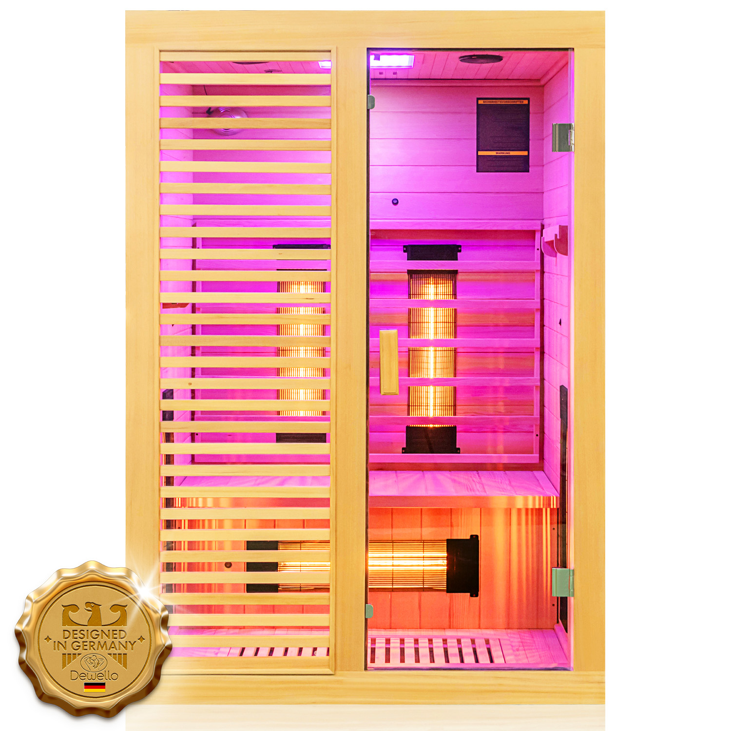 Was macht Dewello Infrarotkabinen besonders?Viele Wärmekabinen anderer Hersteller haben weniger Strahler verbaut. Es fehlt hier zudem der Karbon- Flächenstrahler im Boden. Oftmals wird hier mit einer Energieersparnis geworben.Diese Modelle haben jedoch auch eine deutlich längere Aufheizzeit durch die fehlende Strahlerleistung.Dewello spart nicht bei den Produktionskosten und lässt Infrarotkabinen mit vielen Strahlern fertigen und außerdem sind in fast allen Infrarotkabinen Bodenstrahler verbaut! Durch die Vielzahl an Strahlern sind die Infrarotstrahlen gleichmäßiger und intensiver und die Aufheizzeit der Kabine verkürzt sich extrem.Vergleichen Sie genau, bevor Sie sich für eine Infrarotkabine entscheiden. Immerhin möchten Sie lange Freude an dem Produkt haben und diese viele Jahre nutzen!Bei Fragen zu den Wirkungsweisen und Unterschieden der Strahler beraten wir Sie gerne. Warum 130cm und nicht 120cm breit?Viele Kunden sind der Meinung, dass die standardmäßigen 120cm breiten Kabinen nicht geräumig genug sind, um entspannt saunieren zu können. Der Kauf einer Infrarotkabine soll eine Investition sein, an welcher Sie viele Jahre Freude haben. Die doppelwandigen Holzelemente haben jeweils eine Stärke von ca. 5cm, weshalb Ihnen bei einer 120cm breiten Sauna nur eine Sitzfläche von 110cm übrig bleiben. Hinzu kommt, dass Sie auch ein paar Zentimeter Abstand zu den Strahlern haben sollten.Wir haben uns daher dazu entschieden unseren Kunden breitere Kabinen anzubieten, damit der Innenraum genug Platz bietet und Sie auch zu Zweit angenehm sitzen, schwitzen und entspannen können. Zusammenfassung der Ausstattung: Steuereinheit (automatische Temperaturregelung, Timerfunktion) HiFi mit Bluetooth, SD, FM, MP3, USB LED- Farblichttherapie (Farbe einstellbar) Innenbeleuchtung Ionisator mit Ozon Desinfektion & Aroma Therapie Hochwertige Vollspektrumstrahler (5 Strahler) Hochwertiger Karbon- Flächenstrahler im Boden (1 Strahler) Luftventil für Frischluftzufuhr Hergestellt aus hochwertigem Hemlock Tannenholz (Elementbauweise) Material & Aufbau: Hemlock Holz gehört neben Zedernholz zu den bewährtesten Holzarten im Saunabau. Die Elementbauweise verspricht eine lange Lebensdauer und der Aufbau dieser Kabine kann innerhalb kurzer Zeit erfolgen.Durch langsame Trocknung bei gleichmäßiger Temperatur stellen wir eine hohe Qualität des Holzes sicher. Die Hemlock Tannenholz bietet eine sehr gute Isolierung und somit wird die Wärme optimal innerhalb der Kabine gehalten (Energieersparnis). Das außen liegende Holz wurde ebenfalls mehrfach grundiert bzw. lackiert und ist somit sehr resistent gegen Nässe, Verzug und Risse, wohin das innen liegende Holz unbehandelt ist.Dadurch kann das Holz im Inneren “atmen” oder nach der Benutzung besser trocknen. Während und nach dem Saunagang können Sie zudem das Luftventil im Deckel nutzen. Sie haben somit eine langlebige Sauna und eine optimale Vorbeugung gegen Schimmel.Die Glastür ist aus Sicherheitsglas gefertigt und die Scharniere sind aus Edelstahl! Da der Türgriff aus Holz gefertigt ist, heizt sich dieser bei hoher Temperatur im Innenraum nicht so stark auf, dass Sie sich verbrennen. Die Kabine wird steckfertig geliefert und Sie müssen nur noch die Wände & Stecker miteinander verbinden (Klick-System). Die Strahler und die Steuereinheit sind bereits in den Wänden verbaut. Strahler & Temperatur: Dank den gleichmäßig positionierten Vollspektrumstrahlern, kann die Infrarotkabine sich innerhalb weniger Minuten auf die von Ihnen eingestellte Temperatur aufheizen.Vollspektrumstrahler erzeugen eine tiefere Wirkung als Karbon- Flächenstrahler oder Keramikstrahler. Die Abstrahlungswärme der gesunden A-, B- und C-Strahlen dringt tief in den Körper.Sie haben die Möglichkeit den Temperaturbereich von 30°C bis 65°C zu wählen. Somit kommen Sie bei diesem Modell so richtig ins Schwitzen.Im Vergleich zu vielen anderen Modellen haben wir hier zusätzlich einen Bodenstrahler verbaut (ohne Aufpreis im Lieferumfang).Dieser strahlt zusätzlich von unten, sodass Sie auch im unteren Bereich der Kabine (Fußbereich) Wärme verspüren. Da Sie Ihre Füße direkt über den Strahler platzieren, wurde hier ein gleichmäßig wärmender Karbon- Flächenstrahler verbaut. Die Vollspektrumstrahler lassen sich einzeln abschalten. Daher ist die Kabine auch für Personen geeignet, welche die Wärme an bestimmten Bereichen nicht so gut vertragen. Steuereinheit & HiFi-System: Mit der eingebauten Steuereinheit (Bedienung von Innen) können Sie die Beleuchtung, das HiFi-System, die Temperatur und den Timer zentral einstellen.Sie haben die Möglichkeit, im Vergleich zu vielen anderen Ger&a