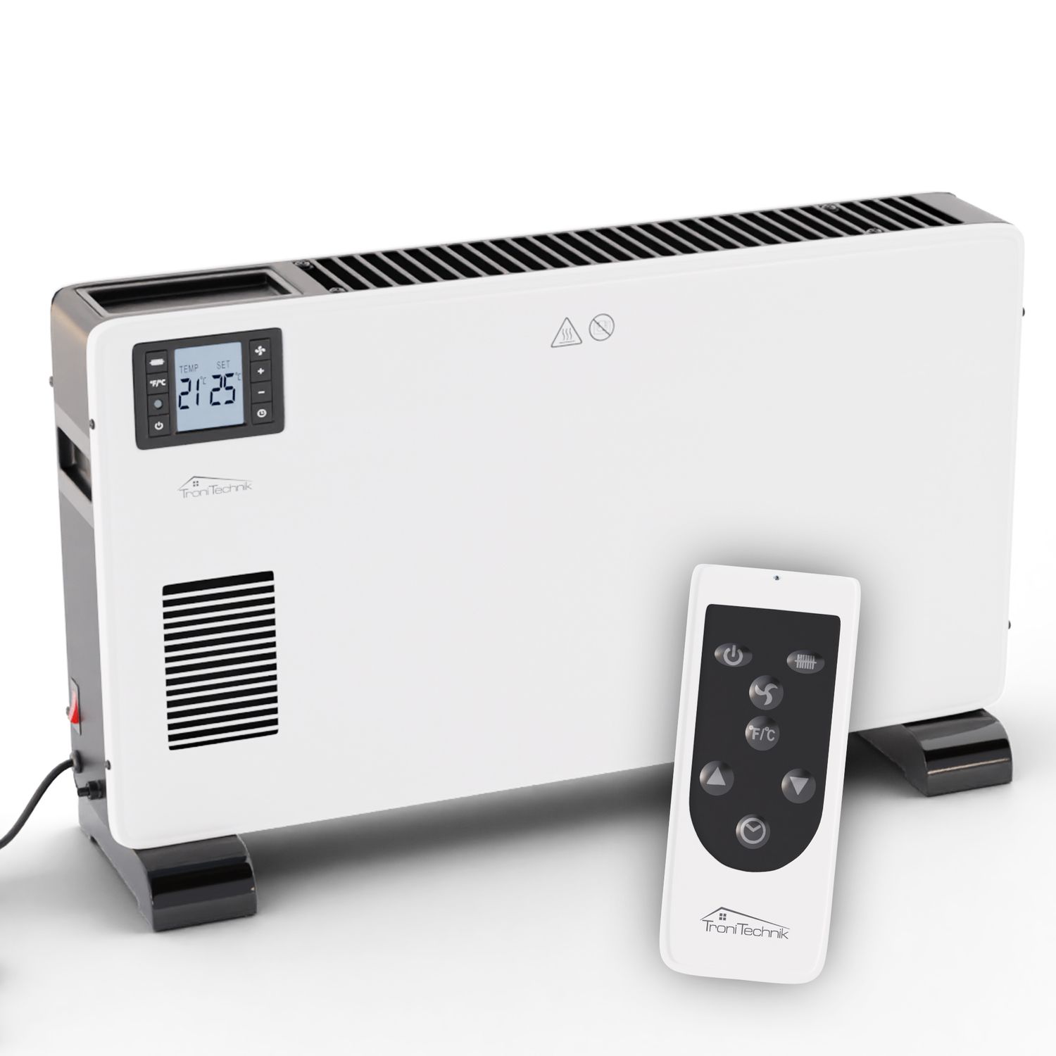 TroniTechnik® Konvektor-Heizung mit LCD, 3 Leistungsstufen & Fernbedienung – 1000/1300/2300W Produktmerkmale: 3 Heizstufen: 1000 / 1300 / 2300 Watt – stufenweise einstellbar Integrierter Thermostat mit Frostwächter-Funktion Überhitzungsschutz und Kippschutz für sicheren Betrieb LCD-Display mit seitlichen Bedientasten Bequeme Steuerung per Fernbedienung Vielseitige Wärmequelle für kalte TageMit dem TroniTechnik® Heizkonvektor sichern Sie sich eine zuverlässige Wärmequelle für Wohn- und Arbeitsbereiche bis 25 m². Drei Heizstufen sorgen für bedarfsgerechte Wärme, während der Thermostat die Raumtemperatur automatisch reguliert. Die integrierte Timerfunktion ermöglicht das Vorheizen Ihrer Räume nach Wunsch. Benutzerfreundlich & mobilDas übersichtliche LCD-Display und die mitgelieferte Fernbedienung erlauben eine bequeme Bedienung. Griffmulden erleichtern den Transport, sodass das Gerät flexibel in verschiedenen Räumen eingesetzt werden kann. Sicherheitsfeatures wie Überhitzungs- und Kippschutz runden das Gesamtkonzept ab. Technische Details: Nennleistung: 1000 / 1300 / 2300 Watt Raumgröße: bis ca. 25 m² Maße: ca. 70 x 18 x 41,5 cm Netzkabel: ca. 140 cm, Schutzklasse I Gewicht: ca. 4,5 kg