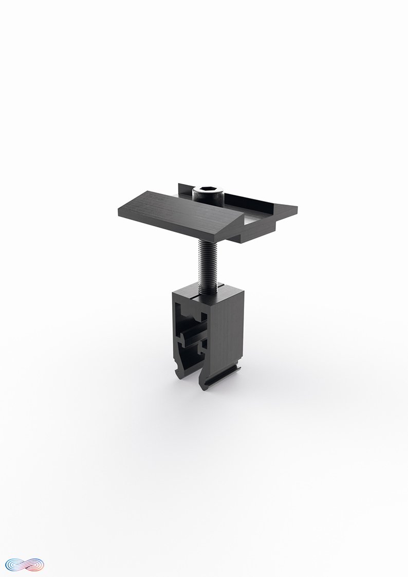 Mounting Systems – MS Modulhalter Befestigung für Photovoltaik – Solarpanel. Halterung MS Modulhalter Mittelklemme . Für gerahmte PV-Module mit einer Rahmenhöhe von 30 bis 40 mm. Die Modulklemmen sind mit patentierter Innenklick-Technologie für alle Systeme anwendbar. Im Lieferumfang enthalten:  1x Modulhalter Mittelklemme , schwarz””